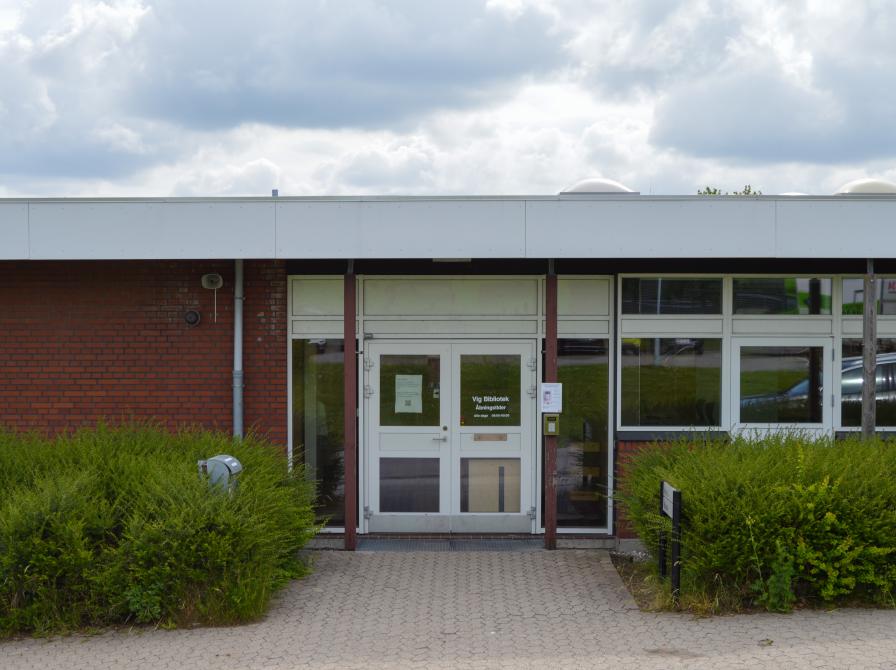 Indgangen til biblioteket ligger ud mod parkeringspladsen ved Vig Svømmehal/Vig Kultur- og Idrætscenter. Du får adgang til det selvbetjente bibliotek ved at registrere dit sundhedskort/lånerkort ved kortlæseren, som er monteret på en pæl, til højre for indgangsdøren og herefter indtaste din pinkode - døren bliver åbnet automatisk efter indtastning.